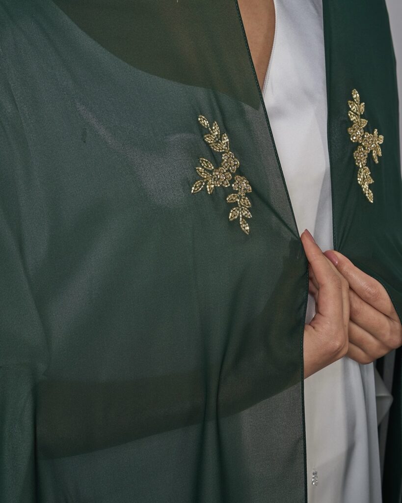 Elegant head scarf made by hand from the finest Indonesian chiffon fabric, hand embroidery in a modern 3D style using the finest quality crystals and Japanese beads so you can stand out in all occasions.